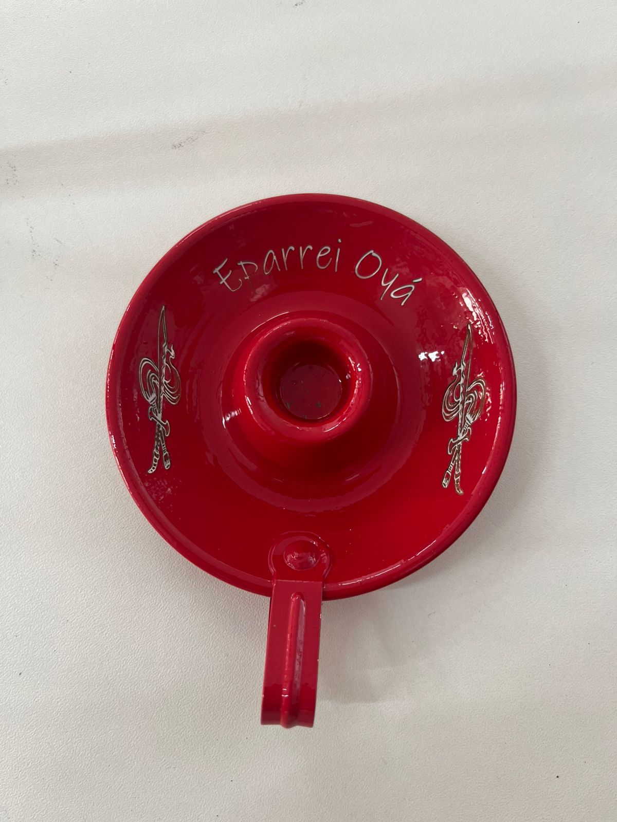 Este é um castiçal para vela palito na cor vermelha, com o tema de Iansã.