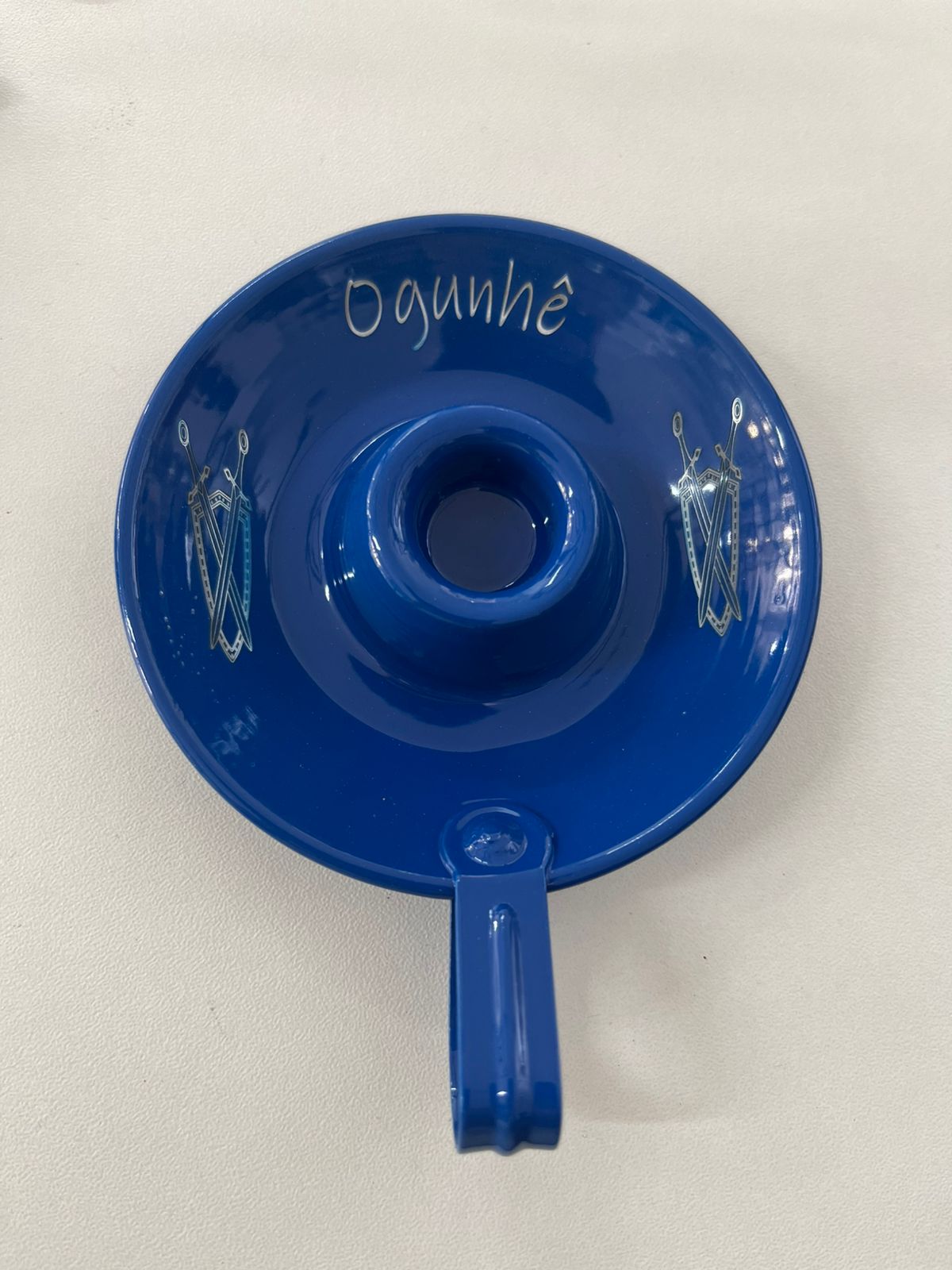 ste é um castiçal de alumínio azul para uma vela, temático do Orixá Ogum.