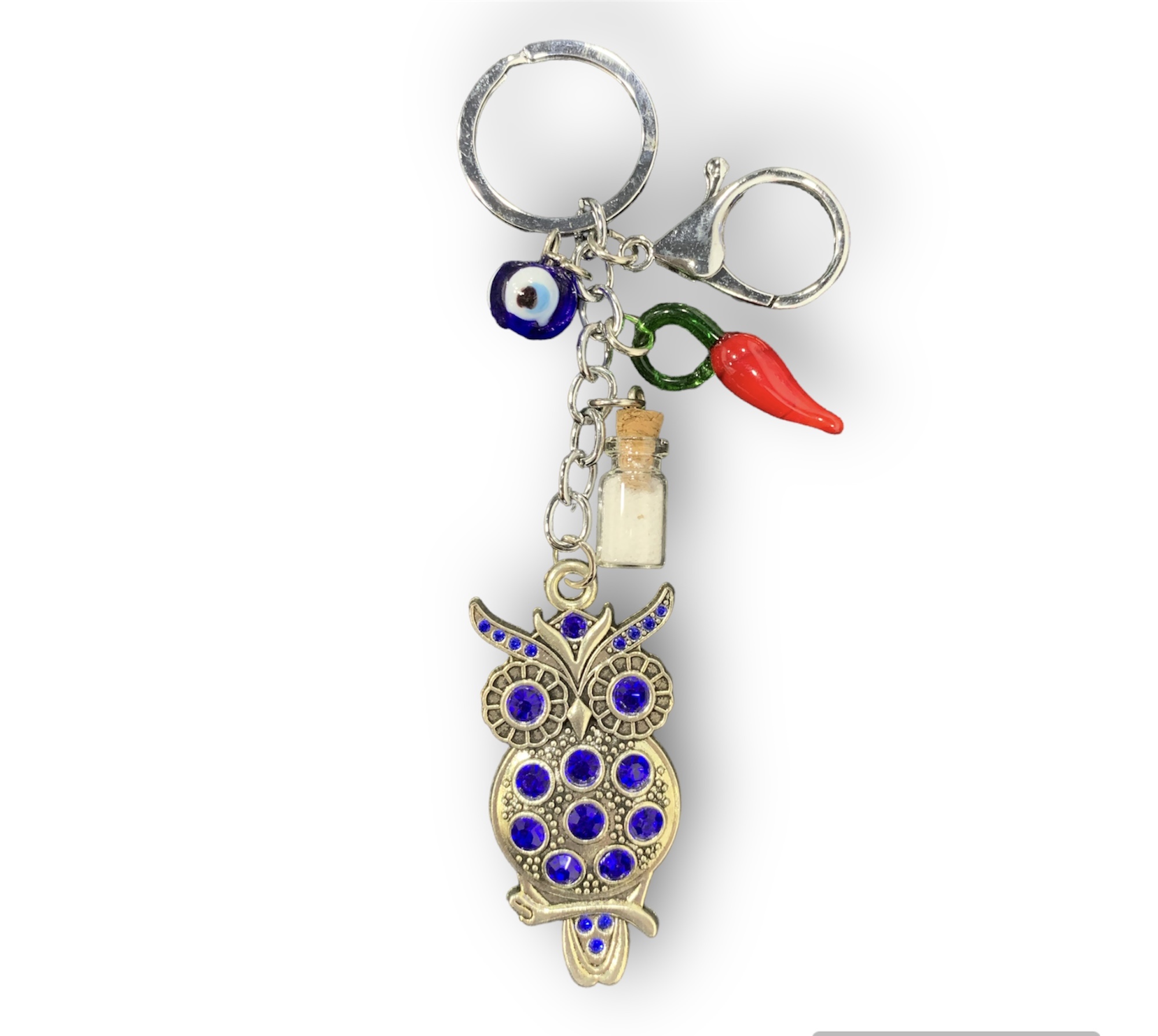 chaveiro lindissimo, coruja em metal com pedras azuis, e um mini amuleto de protecao em vidro.
